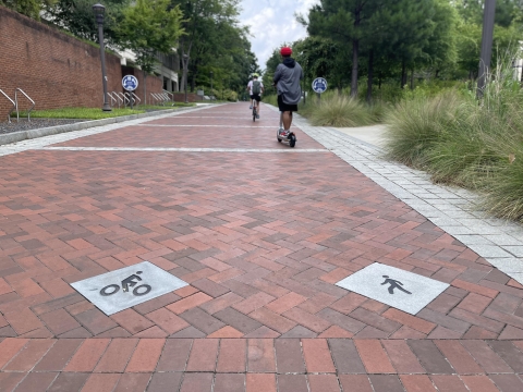 Every day, over 7% of the campus community ride bicycles or scooters to and from campus, and 16% walk. As active transportation has grown over the last few years, Georgia Tech’s campus has evolved to reflect its ongoing commitment to encouraging sustainable transportation and the health and safety of community members. Georgia Tech has 1.5 miles of shared paths, or paths shared by riders and pedestrians, throughout campus, including the paths around Tech Green and the Campus Center, the EcoCommons, and Atlantic Drive, which connects Home Park to the north and Tech Green to the south. Atlantic was first closed to cars in 2004, and, as active transportation grew on campus, in 2019, marked granite pavers were added to help separate slower and faster traffic. Jason Gregory, a senior planner with Georgia Tech Capital Planning and Space Management, saw the effectiveness of the pavers during a trip to Amsterdam to study riding infrastructure with the School of Civil Engineering’s Sustainable Transportation Abroad class. “The pavers remind pedestrians to stay to the right, near the outside of the path, while riders pass on the left. The hills of Atlantic allow riders to move quickly, and, by separating traffic moving at different speeds, we can help to improve the safety of the corridor for all users.” During the week of Oct. 10, the student organization S.M.I.L.E. (Spreading Messages in Love and Encouragement), will bring an art installation to Atlantic Drive to help increase awareness of safety on shared paths. “Riding, walking, and being outside are great for physical and mental health, but they also represent ways for people to connect and engage,” said S.M.I.L.E. Committee Director Laavanya Rajesh. “We hope that this project will encourage community members to learn more about active transportation while working together to add color and creativity to the path.” More information about S.M.I.L.E. and the events they put on can be found on their Instagram @smile.gatech. S.M.I.L.E. will start the project on Monday, Oct. 10. On Wednesday, Oct. 12, from 3:30 to 5:30 p.m., Georgia Tech community members are invited to add their foot and tire prints to connect the designs. Chalk will be available on Atlantic Drive outside of the College of Computing. Free helmets for participants in the online Ride Smart Bike/Scooter Safety Class will also be available for pickup.